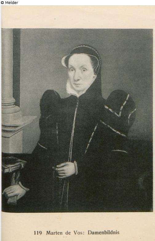 Die auf rotem Sessel Sitzende ist in schwarzem Kostüm der Zeit mit schwarzer Haube dargestellt. Sie hält in der Rechten ihre Handschuhe. Am linken Bildrand Steinsäule. Rechts oben Alter der Dargestellten und das Datum 1563