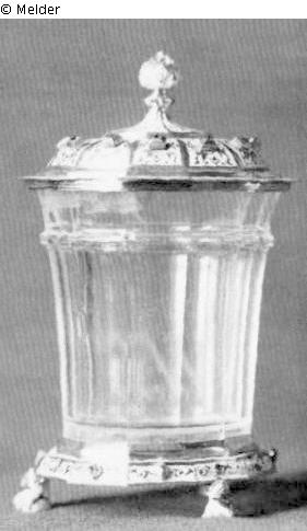 Deckel und Fuß mit drei Löwentatzen aus vergoldetem Silber mit weißen Emailverzierungen. Vierseitig geschliffener Diamant als Deckelknauf. Auf dem Deckel 12 Edelsteine und am unteren Deckelrand 9 kleinere. Am Fuß ebenfalls 11 Edelsteine (der 12. fehlt).