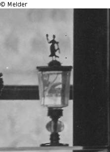 Deckel und Fuß in vergoldetes Silber gefaßt. Auf dem Deckel eine weibliche Figur mit Spiegel aus vergoldetem Silber (Allegorie der Prudentia).