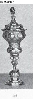 Schlanke, becherförmige Kuppa, runder, eingeschnürter Fuß, am vasenförmigen Schaft und an der Kuppa vergoldetes Rollwerk auf weißsilbernem, mit Kinderköpfen, Tüchern und Nelken verziertem Grund. Am Lippenrand graviert AGF. Auf dem Deckel ein schildhaltender Putto. Nürnberg, um 1600. von Martin Rehlein (gest. 1613). R 3 3962. Französischer Einfuhrstempel seit 1893 R3 5911.