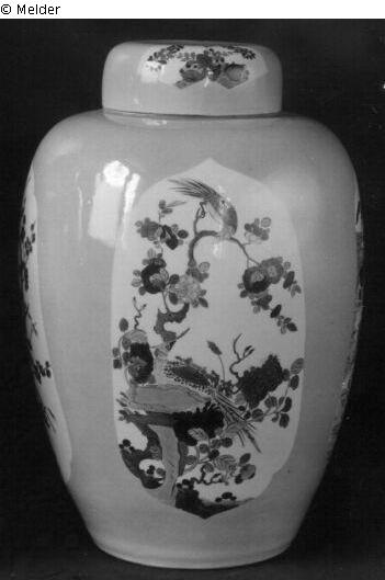 Im gelben Fond sind vier spitzoval passige, weiße Felder ausgespart; in den Reserven Malerei im Stil der famille verte; in der Kartusche ein bizarr geformter, stilisierter Felsen umwachsen von knorrigen Ästen, die prächtige Blüten tragen, über dem Felsen wohl ein nestartiges Gebilde, auf dem ein Vogel sitzt, von einem hohen Zweig schaut ein gleichartiger Vogel zu dem Nest herab; der Deckel trägt wohl zwei fächerförmige Bildfelder mit Blütenzweigen über einer Erdzone im Stil der famille verte.