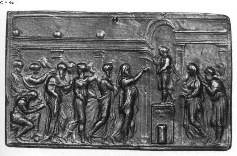Rechteckige Plakette, profilierte Randleiste, oben in der Mitte eine Durchbohrung. Der Christusknabe steht auf einem Postament und predigt den Schriftgelehrten, die teils gestikulierend erwidern, teils miteinander diskutieren, links sitzt einer über ein Buch gebeugt. Von rechts tritt Maria heran, gefolgt von Joseph, der sich auf einen langen Stab stützt. Im Hintergrund sieht man eine Architektur mit Pilastern, Architraven und einem Bogen über dem Kopf Christi. Auf dem Postament erkennt man die fast unleserliche Signatur Valerio Bellis. Die Plakette ist der Abguß einer Kristalltafel von einer Schmalseite der 1530-1532 entstandenen Kassette Papst Clemens' VII., des Hauptwerks Bellis, im Museo degli Argenti in Florenz.