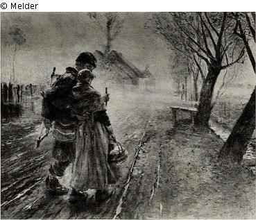 Junger Zimmermann mit seiner Frau an einem neblichen Wintertage auf der Landstrasse. Signiert. Goldener Rahmen.