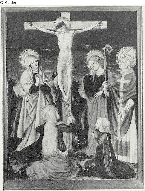 Der Gekreuzigte, umgeben von Maria, Magdalena, Johannes, einem heiligen Bischof und der Stifterin