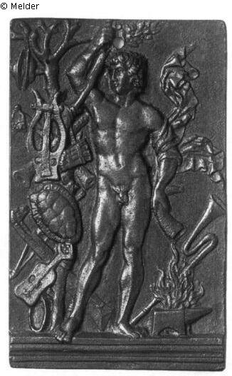 Rechteckige Plakette, unten eine profilierte Randleiste, oben in der Mitte eine Durchbohrung. Der nackte Genius steht in Vorderansicht und greift an den Ast eines Baums, an dem zahlreiche Musikinstrumente (Becken, Kithara, Syrinx, Schalmei, Trumscheid, Fiedel, Tamburin) und ein Schildkrötenpanzer hängen. In der linken Hand hält er ein Horn und um den Arm flattert ein Tuch. Rechts lehnt eine Busine an einem Amboß, aus dem Flammen schlagen. Die Plakette wiederholt im Gegensinn eine Figur aus Mantegnas "Bacchanal an der Kufe" von ca. 1475 (Bartsch 19). Die Figur erscheint auch u. a. als Flachrelief in bemaltem Stuck auf einer florentinischen Truhe von etwa 1470 in der ehemaligen Slg. Stefano Bardini sowie an einer Truhe im ehemaligen Berliner Schloßmuseum. Auf dem Exemplar in der Morgenroth Collection in Santa Barbara (Cal.) hält der Genius neben dem Horn auch noch ein Fell in der linken Hand.