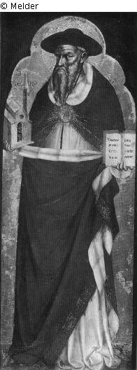 die Maßangaben beziehen sich auf den Mittelteil mit der Darstellung des heiligen Hieronymus; die Schauseiten mit dem heiligen Marcus und dem heiligen Johannes dem Täufer sowie mit dem heiligen Bernhard messen 74 x 27 bzw.- 73 x 28 cm