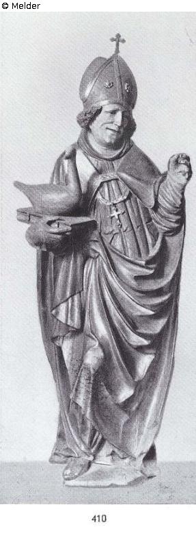 groß, farbig bemalt und vergoldet, mit Mitra und vergoldetem Mantel, mit den Attributen seines Martyriums in der Hand (zu Lot 409 Lepke 1935)