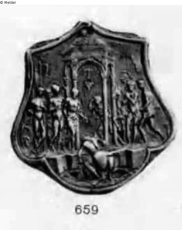 Bange-WV, Nr.: 659 (Α. N. 958. Inv. 1252.) Titel: Der Opfertod des Marcus Curtius. Curtius zu Pferde stürzt sich, von hinten gesehen, in den Abgrund. Zu beiden Seiten eines baldachinartigen Aufbaus stehen mehrere nackte Männer und rechts ein Reiter. Rechts am Rande des Abgrundes die Bezeichnung IO · F. Diente als Verzierung eines Schwertknaufes. Flachrelief. Bronze. Kartuschenformat. H. 9,4, Br. 6,1 cm. Oben durchbohrt;