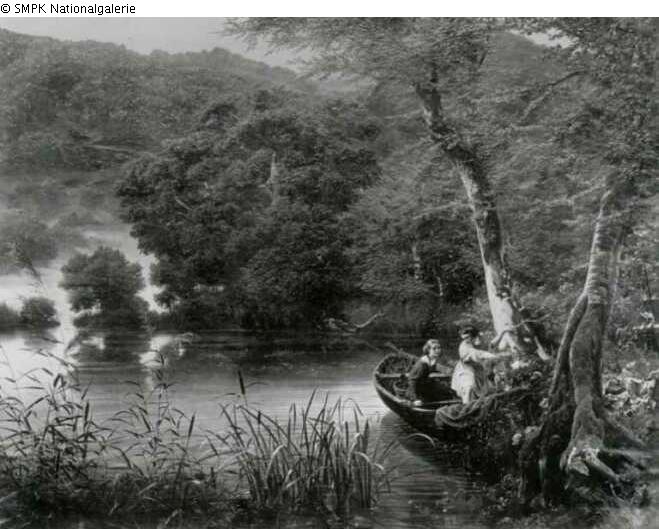 Tafelmalerei: Bild: See & Laubwald & Bäume: Eiche & Bäume: Buche & Pflanzen und Kräuter: Schilf & Treffen der Liebenden & Ruderboot, Kanu, etc. & abendliche Landschaft (manchmal benannt als: Vesper)