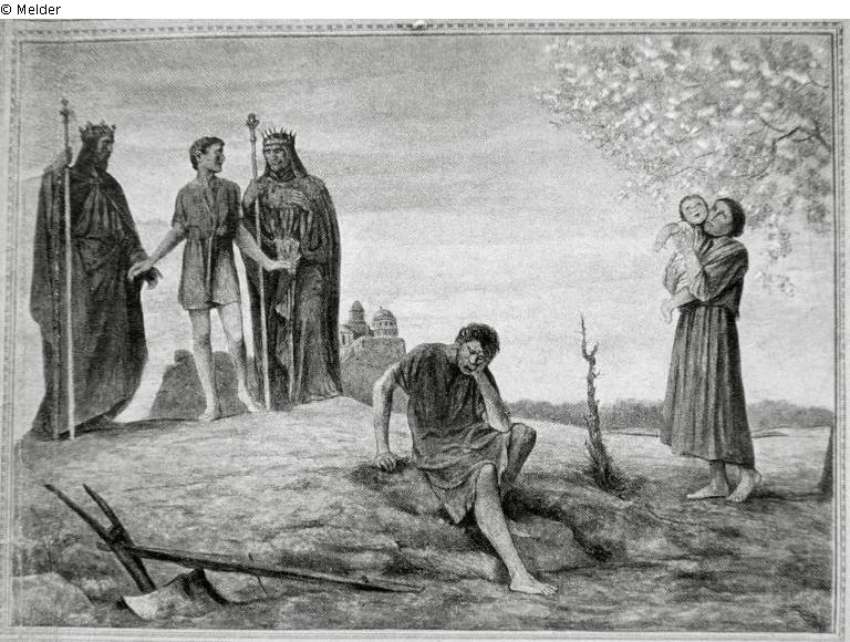 Eine Folge von fünf Bildern nach den Wandgemälden in der Aula des Kaiser Friedrich Gymnasiums in Frankfurt/Main: Zweifel, Sorge, Hoffnung. Auf der Anhöhe links steht zwischen zwei Herrschern der Jüngling, noch unentschlossen, welchen Ruf er folgen soll. Sorgenvoll ist der Bauer neben der zerbrochenen Pflugschar zusammengesunken, hoffend hebt die Mutter das Kind zum blühendne Baum empor, r.u. Monogramm des Künstlers. Die Abbildung zeigt das erwähnte Wandgemälde, das als Vorlage diente. Gemalt 1903.