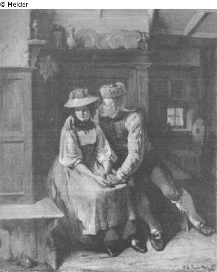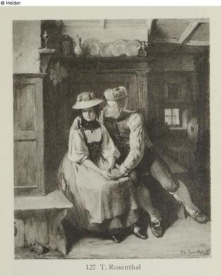 In einer holzvertäfelten Ecke sitzt auf der Wandbank ein Bauernbursche, der ein junges Bauernmädchen umschlungen hält. / Ein junges hübsches Paar in hessischen Kostümen sitzt auf einer Bank in einem vertäfelten Raum; der Bursche wirbt stürmisch um das Mädchen. Goldrahmen / Ein junges hessisches Bauernpaar sitzt in einer vertäfelten Bauernstube auf einer Bank; der Bursche spricht auf das Mädchen ein. Bez. r. u.: T. E. Rosenthal 1870, München, Goldrahmen.
