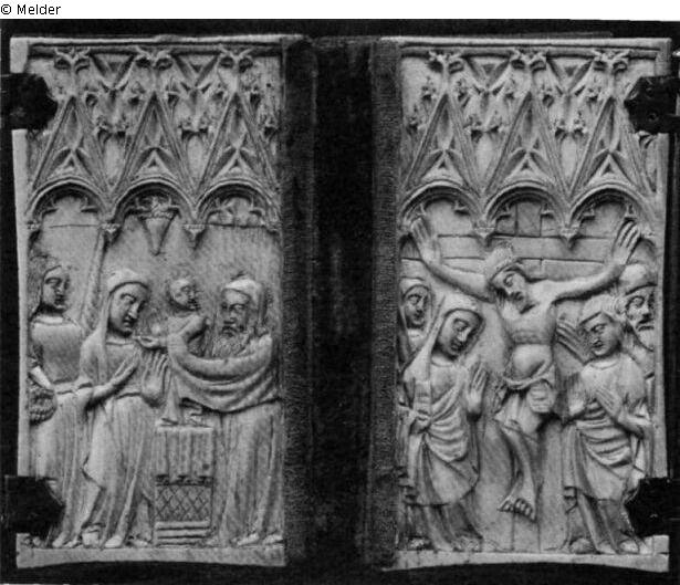 Gotisches Diptychon mit zwei roh gearbeiteten Hochreliefs: Anbetung der Weisen und Kreuzigung.