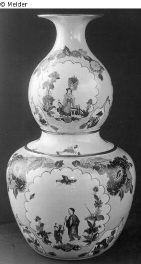 Im gelben Fond rosettenartige Reserven mit Chinoiserien, unten: Chinese mit langem Stock und Kind mit kleinem Fächer zwischen hohen Blütenstauden und darüber fliegendem Vogel, oben: Chinese mit großem Fächer und Kind in einer durch einen Zaun angedeuteten Gartenlandschaft; große Rosetten werden rechts und links unten flankiert von blattförmigen Reserven, in die Blatt- und Blütenzweige gemalt sind; über den Rosetten großblütige Blatt- und Blütenzweige auf den Fond gemalt; das Dekorationsprinzip des unteren und oberen Teils ist gleich; die Einschnürung ist mit flachen, goldenen Wulsten abgesetzt und weiß mit unregelmäßig verteilten Streublümchen bemalt.
