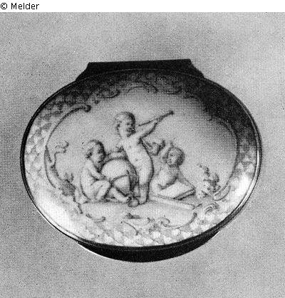 Katalog Hans W. Lange / Auktion 18.-19.11.1938, Kapitel "Dosen", S. 68: "536. Ovale hohe Dose, bemalt mit hellgelbem Schuppenfond, darin ausgespart rocaillengefaßte ovale Felder mit grauen Puttenszenen über rosa Grund. Im Deckel Kriegsgöttin auf Wolken und Putten mit Gerätschaften. Ziselierte Goldfassung. Meißen, Marcolini-Zeit. H. 4 cm, Durchm. 9 : 6,7 cm. Tafel 37."