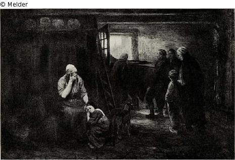 In einem Holländischen Fischaerhaus wird von Nachbarn des Verstobenen ein Sarg aus der Tür getragen, eine Frau und ein Knabe folgen, links am Bett die weinende Mutter mit ihrer Tochter. Signiert. Silberner Rahmen.
