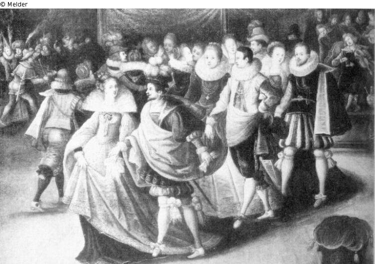 Arranged in circle gentlemen and ladies dancing. In front of them are a lady in a golden dress and a gentleman in a red coat. To the right are musicians on a podium.