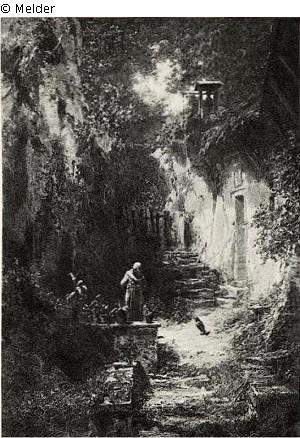 Im Sommer in einem Hohlweg, in den Sonnenlicht hinenfällt, unterhält sich ein Mönch mit seinem Rabben, vor ihm ein Mäuerchen mit Blattpflanzen, rechts eine Treppe, in der Höhe ein Glockenstühlchen. Monogrammiert. Silberner Rahmen.