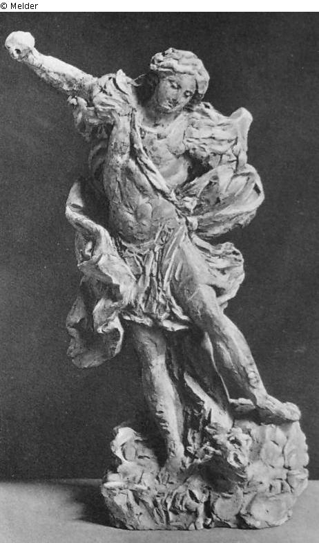 Erzengel Michael (eventuell der Hl. Georg?) auf dem Drachen stehend, den rechten Arm zu Stoß erhoben, hellrötlich - braunes Terrakotta - Modell
