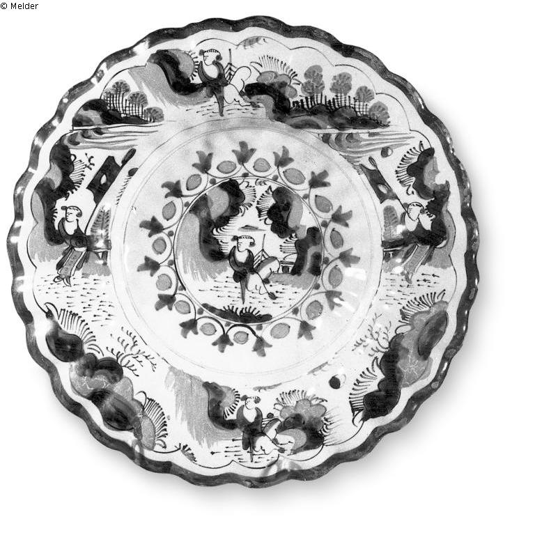Fächerplatte - Tiefe Buckelschale mit gewelltem Rand. Auf grünlicher Glasur Chinesenmalerei in Gelb und tiefem Blau. Im Spiegel Chinese in Landschaft mit Felsen und Architektur. Umlaufender innerer Rand von Dreiblättern und zitronenartigen Ovalen. Auf dem äußeren Rand Landschaften mit einzelnen Chinesen. (Gerippte Fayenceschale mit tiefem Rand. Hellblau. Chineserien in Dunkelblau und Gelb.)