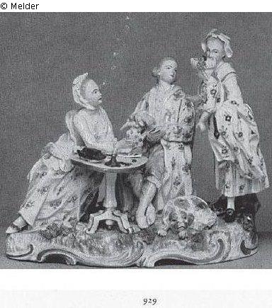 Ehepaar in Morgentoilette am Tisch und Zofe mit Kind auf dem Arm. Die Frau in rotgeblümtem Kleid und weißem Frisiermantel sitzt auf gelb gepolstertem Hocker und zeigt dem Kind eine Puppe. Der Mann in blau und grün geblümtem Morgenrock, purpurnen Hosen und gelben Pantoffeln sitzt auf gelb gepolstertem Armlehnstuhl und nimmt eine Prise aus einer Tabatiere. Auf dem ovalen Tisch silbernes Schreibzeug, Leuchter, Lichtputzschere, Petschaft, Brief, Bleistift und Papier. Das Kind trägt ein gelbes Fallhütchen und violett geblümtes Kleid, um die Schulter eine Klapper an gelbem Band; die Zofe grün gestreiften, purpurn geblümten Rock. Zu Füßen des Herrn liegt ein Hund. Der hoch gewölbte Sockelboden grün und gelb mit grünen Moosauflagen, eingefaßt mit golden gehöhten weißen Rocaillen. Sockelrand vorn repariert. Marke: CT 72. Modell von Karl Gottlieb Lück.
