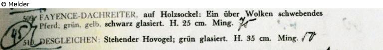 Sammlung Eduard Fuchs, wahrscheinlich erworben nach 1924 und in dessen Besitz bis 1933; 25.10.1933 Beschlagnahmung durch die Gestapo; zwangsweiser Verkauf (Zahlung Reichsfluchtsteuer) durch seine Tochter Gertraud Fuchs: Versteigerung Auktionshaus Rudolph Lepke Berlin, Katalog 2115, S. 33 - am 15.10 und am 16.10.1937 wurde dieser Dachreiter unter Nr. 509 versteigert: „FAYENCE-DACHREITER; Stehender Hohvogel, grün glasiert. Höhe 35 cm. Ming“.
