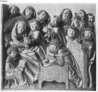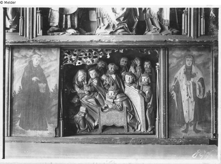 Es fehlen: Kopf der Figur des Hl. Wolfgang (aus dem Schrein, rechte Figur), der linke Fügel mit: Papst mit Buch, Hl. Stephan (beide oben); Hl. Egidius mit Reh, Hl. Sebastian (beide unten). Die Figuren sind etwa 57 cm hoch.