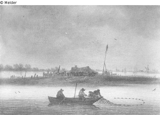 Im Vordergrund vier Fischer in einem Ruderkahn mit einem bogenförmig ausgelegten Netz beschäftigt; dahinter auf einer Flußinsel eine Hütte mit Zäunen und einer in die Höhe ragenden Holzstange; im Hintergrund bei flachem Horizont links Sträucher und Bäume, rechts Schiffe auf dem Fluß und die Silhouette einer Kirche; Signatur: J Schoeff 1650; Maße: 25,5 x 36 cm