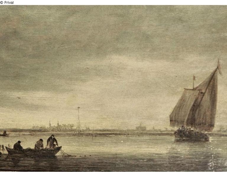Graugrünes Wasser, im Vordergrund dunkelbraungraue Streifen, links Boot mit Fischern, einer rudernd, die beiden anderen das Netz anziehend, weiter hinten ein weiteres Ruderboot angeschnitten, rechts im Mittelgrund Segelboot in Fahrt, im Hintergrund, zartgraugrüne Streifen flachen Landes, wenige Häuser und Baumgruppen, fast ¾ des Bildes gelblicher, graubewölkter Himmel