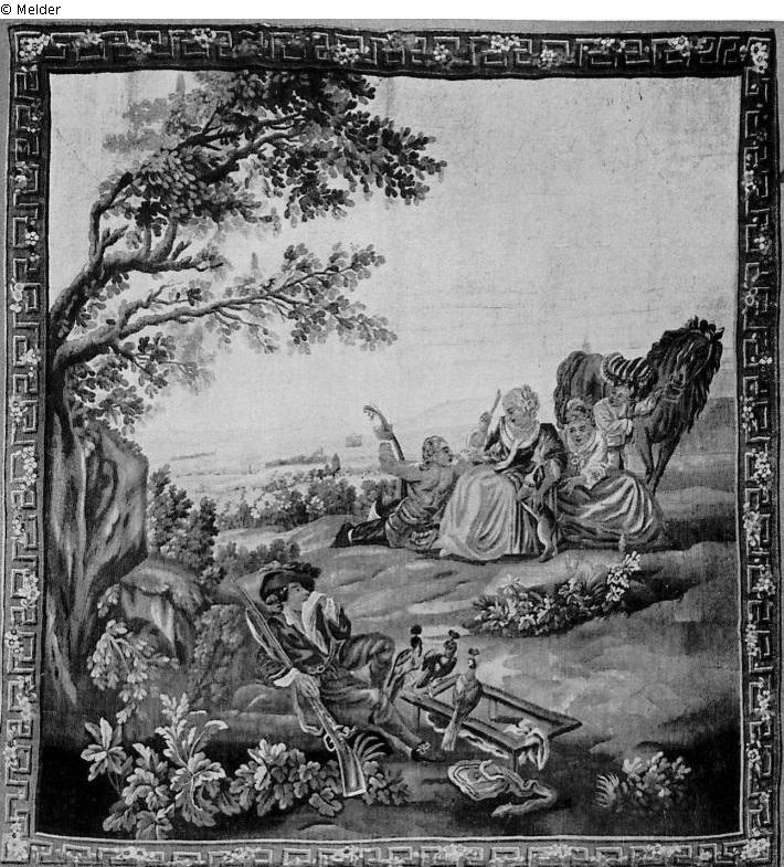 in einer hügeligen Landschaft mit einem Baum im Vordergrund links eine Gruppe von sitzenden Damen, denen ein Kavalier auf der Laute vorspielt, rechts hält ein Knabe ein Reitpferd, im Vordergrund sitzt ein Jäger mit dem Gewehr, neben ihm drei Falken; Mäanderbordüre, mit Blumen durchzogen