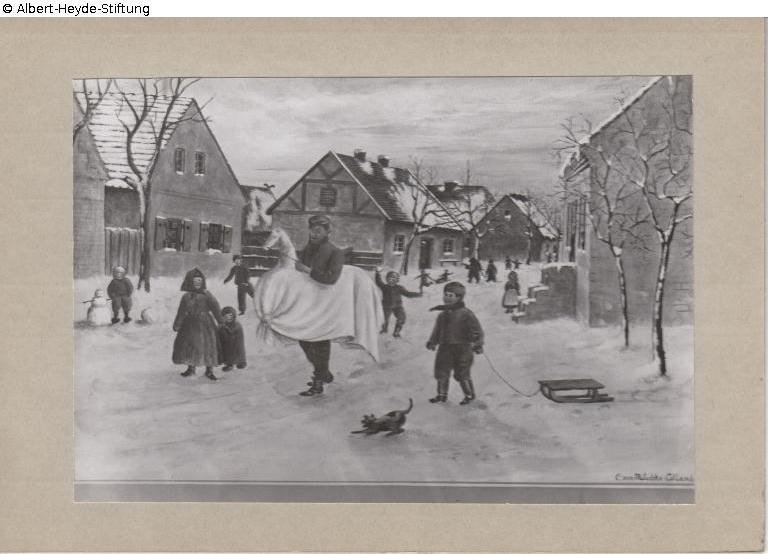 Winterlich dörfliche Straßenszene: Männliche Gestalt als Schimmelreiter umgeben von spielenden Kindern. Signatur unleserlich.