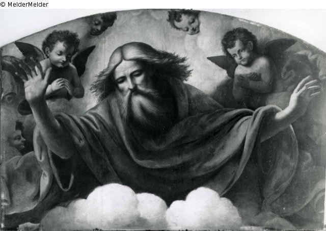 Gottvater auf Wolken thronend, dabei verehrende Engel