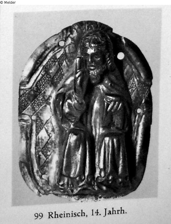 Gottvater, sitzend, mit der Rechten segnend und mit der Linken das Buch haltend. Hintergrund mit Rautenmuster; Relieffigur