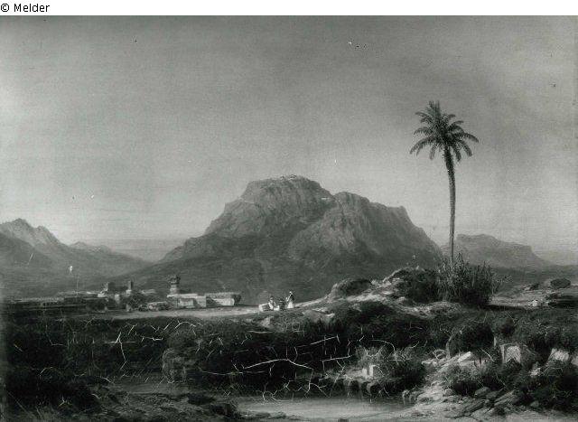 Griechische Landschaft, links einzelne Palme, rechts Ausblick auf eine Stadt