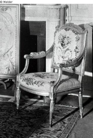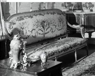 Vergoldete, geschnitzte Holzgestelle. Beauvais-Tapisseriebezüge in Wolle und Seide, auf hellem Grund Rosensträuße und Volutenranken mit Tauben, umgeben von einer Rosengirlande auf hellblauem Grund; Sofa: H 117,5 cm, B 167 cm, T 60 cm; Stuhl: H 94 cm, B 57,5 cm, T 52,5 cm; Quelle: Hans W. Lange: Gemälde und Kunstgewerbe aus einer bekannten Privatsammlung - Verschiedener Kunstbesitz. Berlin. Versteigerung am 22. und 23. Juni 1939. Katalognummer 154 (Kürzel: F.A., Charlottenburg); vielleicht fünf Beauvais-Sessel zurück (nicht verkauft); Fotografien von Martha Huth, in: LAB, F Rep. 290-05-01 Nr. 35ff.