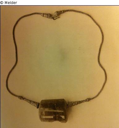 NARA: Greek gold necklace with large emerald prism pendant. Late IV century B.C., 45 cm (length), 4,2 x 2,8 cm (size of emerald) 324 crt. [= ca. 65 gr.] [...] Prof. Zahn writes: The chain is plaited of finest gold wire. On its loose ends are two small club-shaped tubes, decorated with delicate filigree work ending in lion's heads. Hook and eye for fastening the chain are held by the lion's mouths. In the middle of the necklace is the large emerald prism; on either side the chain ends in long conicle tubes decorated with lozenges and triangles of gold dots, executed in granulation technique which had developed to high perfection in the classical period. The emerald is a three-siede prism of unsual size, its edges are rounded, in its surface are cut several round concave indentations.