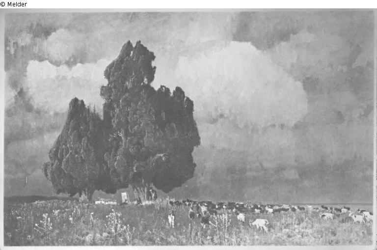 Antikisierende Grabes-Darstellung vor Wiesenlandschaft mit Ziegenherde unter großen Zypressen vor aufziehenden mächtigen Gewitterwolken mit zwei lagerndem Hirten.