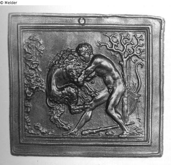 Rechteckige Plakette, ringsum breiter, profilierter Rahmen. Herkules, im Profil nach links gegeben, beugt sich leicht vor und schreitet mit dem rechten Bein nach vorn aus. Er würgt den Löwen, der sich zusammenkrümmt und sich mit den Pranken gegen das Bein des Helden stemmt. Links sieht man einen Felsen mit Büschen, rechts einen entlaubten Baum, an dem Bogen, Köcher und ein Pfeil hängen. Auf dem Boden liegt die Keule. Die Plakette wurde antiken Gemmen nachempfunden, vgl. Gori I, 36, 9 / 37, 1 = Reinach 1895, Tafel 18, und Furtwängler 1900, Tafel XVII, Nr. 57, und Band III, S. 188, Abb. 127. Nach Bange stammt sie von einer jüngeren Hand, die Modernos Vorbild kopiert und erweitert hat. Die Plakette hat die gleiche Größe und Rahmung wie die "Kampfszene" (Nr. 100), beide waren offenbar als Seitenteile eines Kästchens vorgesehen.