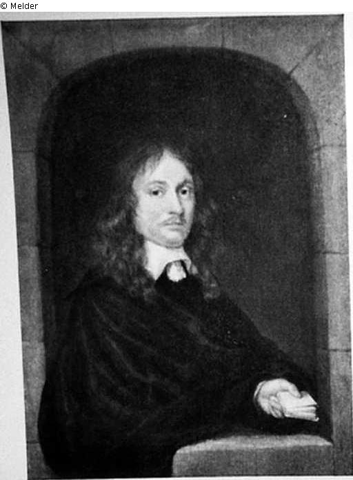 Steinerner Fensterrahmen, darin das Brustbildnis eines dunkel gekleideten Herrn mit weißem Kragen und langen braunen Haaren. Die Linke in der unteren rechten Bildecke hält ein Buch. Goldrahmen.
