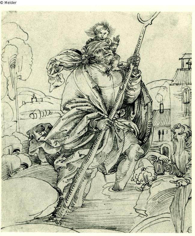 Wasserzeichen: Stierkopf. Bears a false Dürer monogram in the folds of St. Christopher's garment Inscription on verso: “nr. 13” Exhibitions: Albertina, Vienna, Hans Baldung Grien: Ausstellung im 450 Geburtsjahr des Meisters, Spring 1935 (Nr. 1); The Royal Academy, London, Drawings by Old Masters, 1953 (Nr. 212; The Arts Council, London, Old Master Drawings from the Collection of Mr. C. R. Rudolf, 1962 (Nr. 160, pl. 28 as South German, ca. 1500).