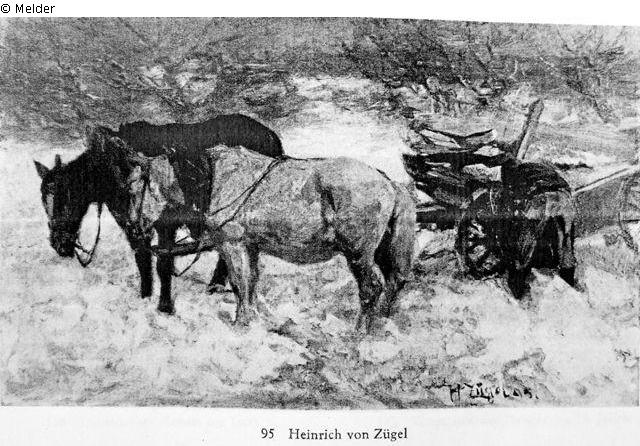Holzfuhrwerk im Schnee. Ein Schimmel und ein Brauner mit gesenkten Köpfen im tiefen Schnee. Rechts Wagen, Bauer, niedere Bäume. Rechts unten bezeichnet: H.Zügel 95; Eugen Diem: Werkverzeichnis Zügel 1975, Pos. 382, Abb.
