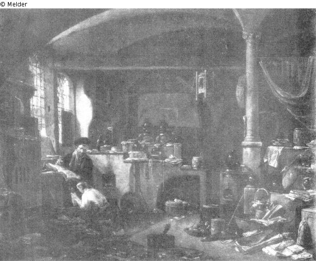 A large workshop with many alchemist¿s dishes and two barred windows to the left and column to the right. At the window is the alchemist, seated before an open book on the table. At his feet is apprentice on his knees, grinding some substance in a pestle.