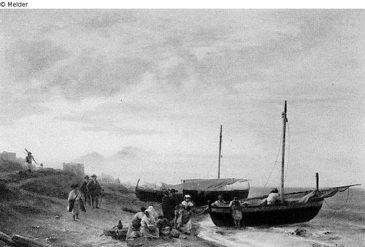 mit Fischerbooten und Fischerfamilien, Abendstimmung; G.-R.; signiert
