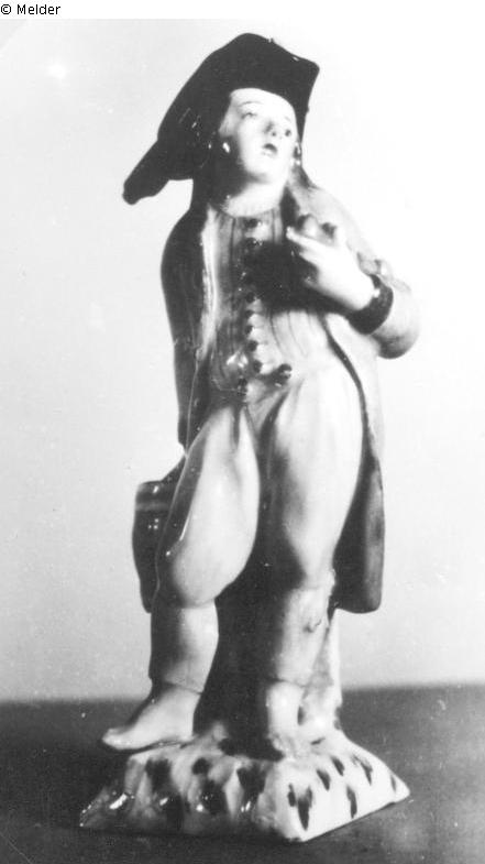 Auf viereckigem Sockel, in der Rechten ein Fäßchen, in der Linken Früchte auf einen Stab gereiht, bunt bemalt. Szeptermarke.