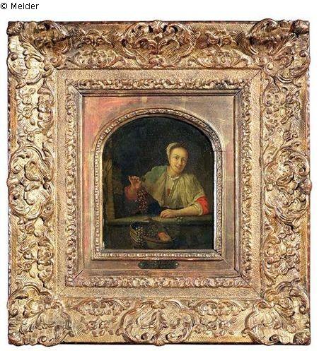 Junges Mädchen in einer Fensternische, in der Hand eine Weintraube haltend
