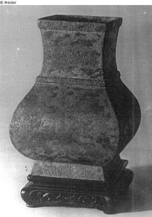 Hu. Bauchige Vierkantform. Grüne Patina. An einer Wandung ein Loch. Silbrige Bronze