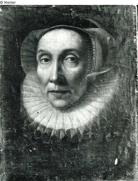 Kopf einer alten Frau mit Häubchen und Kragen
