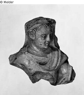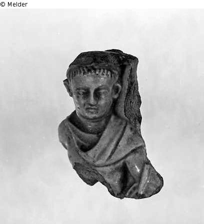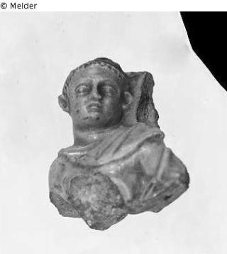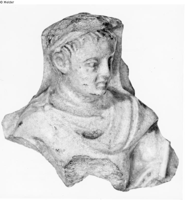 Fragment eines Reliefs; Kopf und Teile des Oberkörpers eines Mannes mit Mantel erhalten; Kopfwendung und leichte Körperdrehung nach rechts
