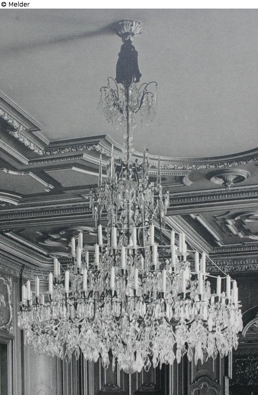 Dresdner Schloss, 1. OG Nordflügel, Spiegelsaal; Im Inventarverzeichnis Nr. 1 vom 31.01.1920, als Bestandteil des Auseinandersetzungsvertrages des Freistaates Sachsen und dem vormaligen Königshaus von 1924, wird im „Spiegelsaal“ „1 großer elektr. Bronzekronleuchter mit Glasbehang, 66 Kerzen“ aufgeführt, welcher „Vom Staat angekauft“ wird; Ein genauer Bergungstermin während des 2. WK ist nicht aktenkundig, die Bergungsmaßnahmen wurden im Sommer 1944 beendet. Der Kronleuchter des Spiegelsaales wurde wahrscheinlich mit dem Transport vom 26.04.1944 nach dem Bergungsort Schloss Rammenau verbracht. Zu den Verlustumständen dieser Objekte ist nichts bekannt. Ein Verlust im Zusammenhang mit den Ereignissen des 2. WK wird vermutet.