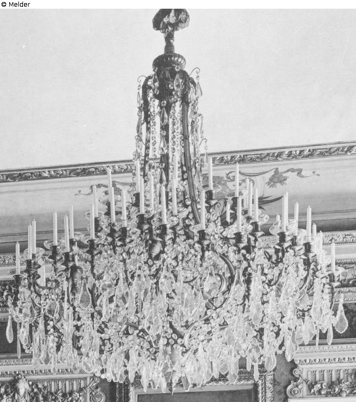 Die Rechnung der Fa. Ferdinand Barbedienne aus Paris vom 05.09.1868 führt für den „Salon d Entrée“ (Empfangssalon) auf: „1 Kronleuchter Stil Ludwig XIV. mit einem Gestell aus vergoldeter Bronze mit 70 Lichtern, mit Kristallen aus Baccarat verziert 3600“; Behang Fa. Baccara, Nancy