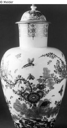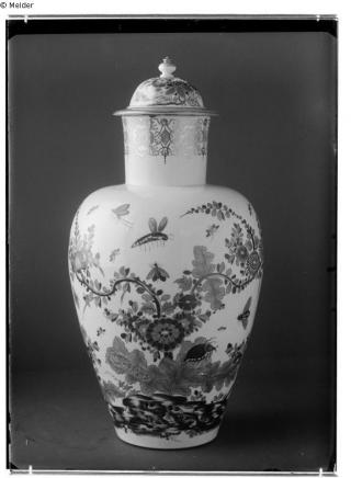 "5. Deckelvase mit flacher Schulter, über den Gefäßkörper frei verteilte Blütensträucher mit fliegenden und sitzenden großen Insekten, Schmelzfarbenbemalung in: Grün, Blau, Rot, Purpur, Gelb, Braun, Gold, am Vasenrand Goldkante auf weißem Grund, Deckel: Lüsterfarbenrand, Meißner Porzellan, steiles AR III 103 Höhe: 36 cm (mit Deckel), Durchmesser: ca. 18 cm."